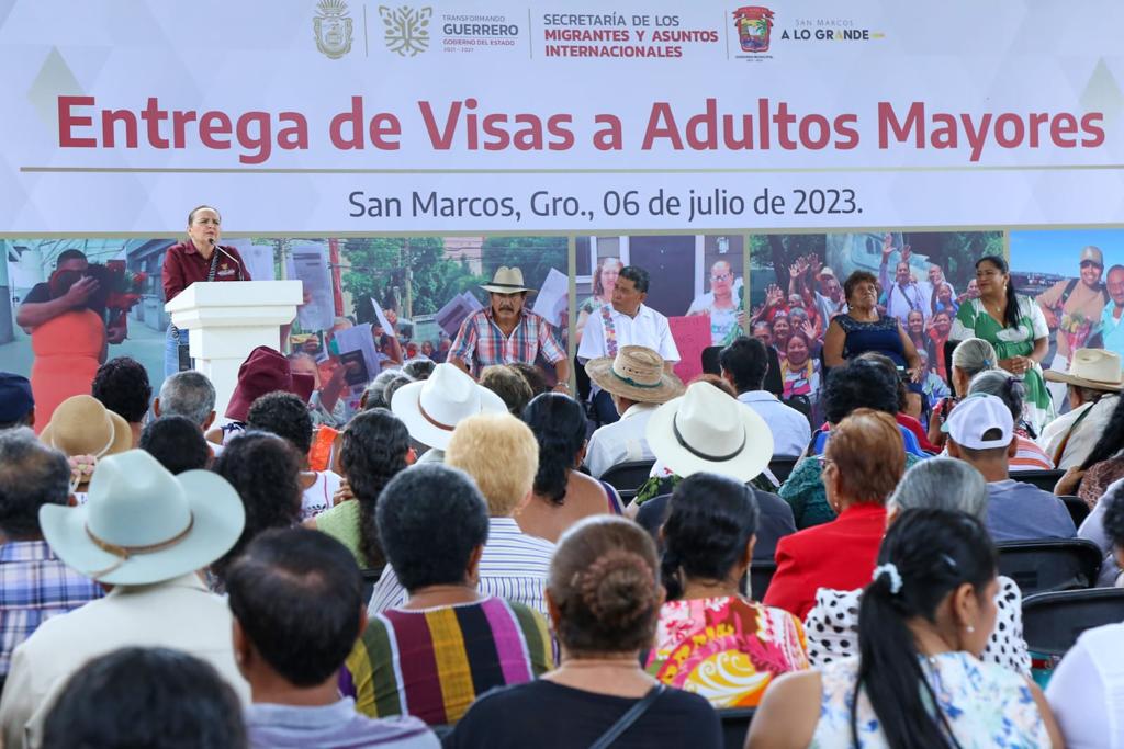 San Marcos, Gro., 06 de julio de 2023.- Con el objetivo de reunificar a padres guerrerenses con sus hijas e hijos radicados en EE.UU., y como parte del programa “Lazos Migrantes”, la titular de la Secretaría del Migrantes y Asuntos Internacionales de Guerrero, Silvia Rivera Carbajal, a nombre de la gobernadora Evelyn Salgado Pineda, entregó 124 visas americanas a adultos mayores, las cuales se encontraban pendientes debido a la pandemia.
