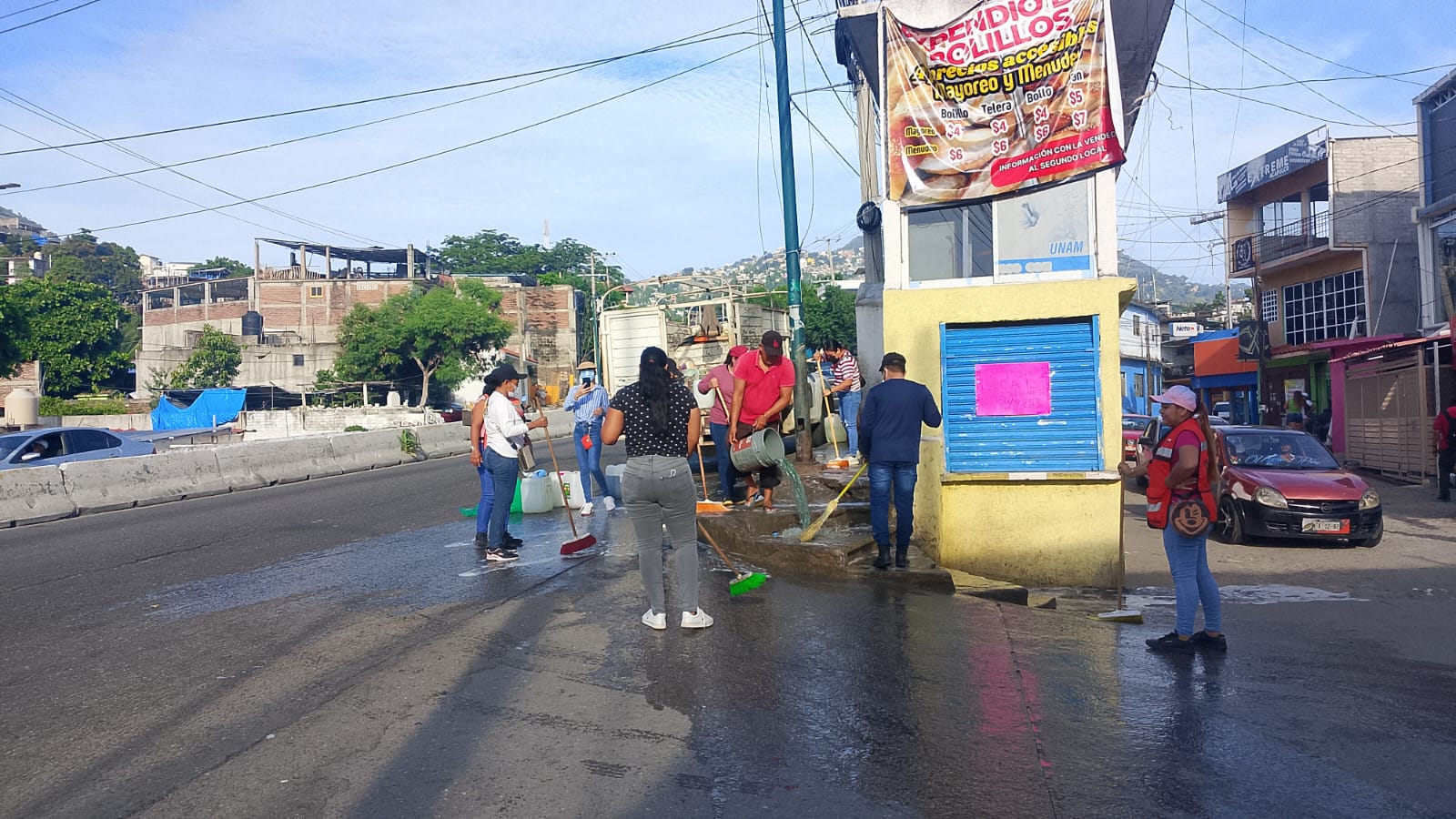 Durante la jornada también se llevaron a cabo tareas de poda de árboles, retiro de maleza en banquetas y camellones, levantamiento de escombros y limpieza profunda con agua, cloro y jabón, con el fin de eliminar focos de infección que afectan la salud pública y el entorno de las familias acapulqueñas.