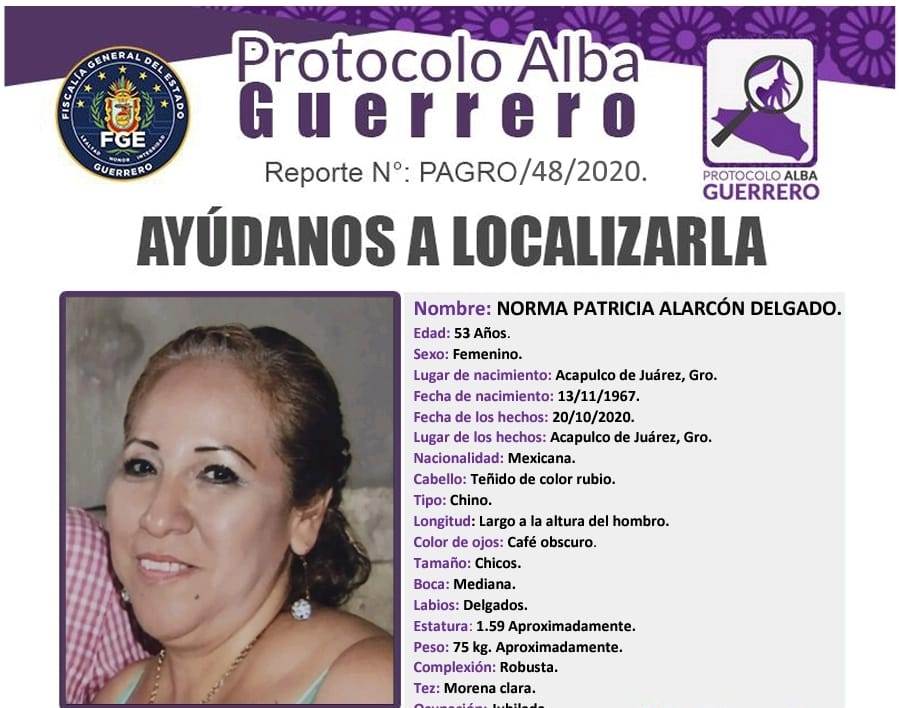 Acapulco, Gro., a 23 de octubre de 2020.- Como Norma Patricia Alarcón, de 53 años y trabajadora jubilada del Instituto Mexicano del Seguro Social, fue identificada la mujer hallada enterrada en la playa de Luces del Mar, en las inmediaciones de Pie de la Cuesta.
