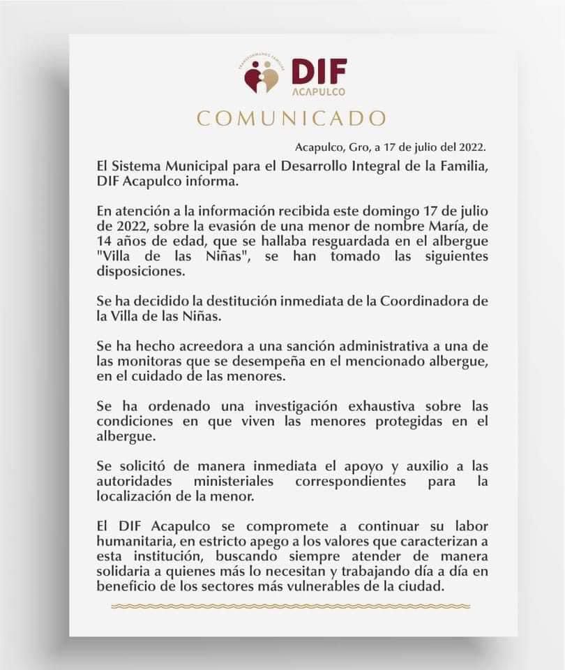 Acapulco,Gro., a 18 de julio del 2022.-El DIF Acapulco emitió un comunicado sobre la desaparición de otra menor de la Villas de las Niñas; informando además que destituyeron a la coordinadora de esta estancia y se sancionó a una de las monitoras de la institución; las autoridades correspondientes ya inician sus investigaciones.