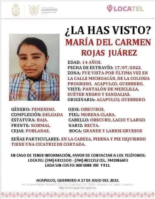 La adolescente María del Carmen Rojas Juárez de 14 años de edad, escapó del albergue Villa de Las Niñas del Sistema Municipal para el Desarrollo Integral de la Familia (DIF) Acapulco y se encuentra desaparecida.
