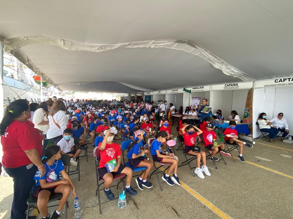 Los primeros en visitar la embarcación fueron los estudiantes de la primaria Manuel Ávila Camacho, el Colegio Militarizado Madrid y la Secundaria Técnica Número 1, en el segundo día de visitas han recorrido la cubierta alumnos de la Telesecundaria Unidad Ciudadana de la colonia Simón Bolívar.