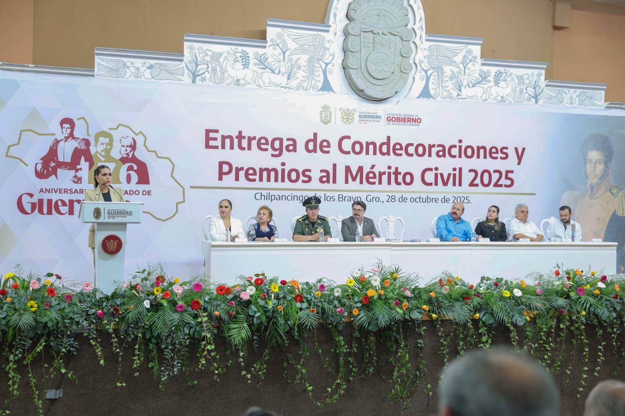 Chilpancingo, Gro., 28 de octubre de 2025. – En el marco del 176 aniversario de la Erección del Estado de Guerrero, la gobernadora Evelyn Salgado Pineda encabezó la ceremonia de entrega de Condecoraciones y Premios al Mérito Civil 2025, un reconocimiento al esfuerzo, talento y vocación de servicio de mujeres y hombres que con su ejemplo engrandecen el nombre de la entidad.