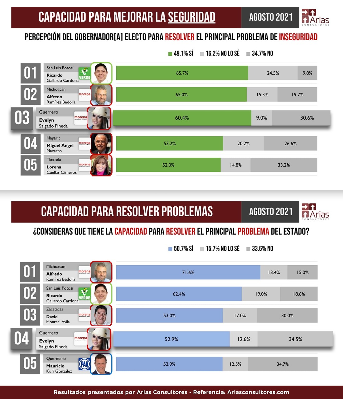 En lo que respecta a la pregunta sobre la “capacidad para resolver problemas”, Evelyn Salgado se ubicó en el cuarto lugar, entre 15 gobernadores y gobernadoras electas de distintos partidos políticos, obteniendo el 52.9%.