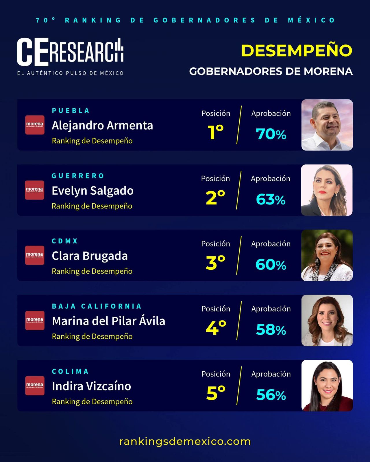 Chilpancingo, Gro.- La gobernadora guerrerense Evelyn Salgado Pineda inicia el 2026 ubicándose en el segundo lugar de la lista de los mandatarios estatales de Morena mejor evaluados en desempeño a nivel nacional de acuerdo al 70 Ranking de Gobernadores de México de CEResearch