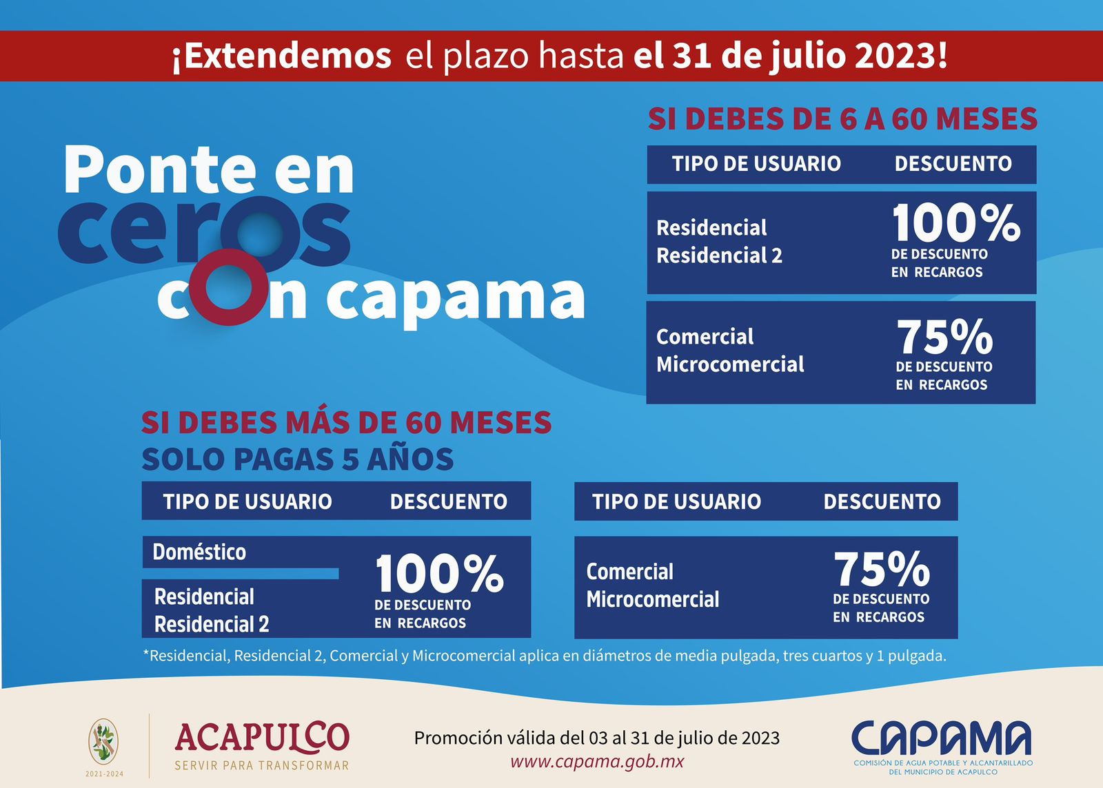 Acapulco, Gro., 03 de julio de 2023.- Por instrucción de Abelina López Rodríguez, presidenta municipal, la Comisión de Agua Potable y Alcantarillado del Municipio de Acapulco (CAPAMA), extiende la campaña de descuentos hasta el 31 de julio.