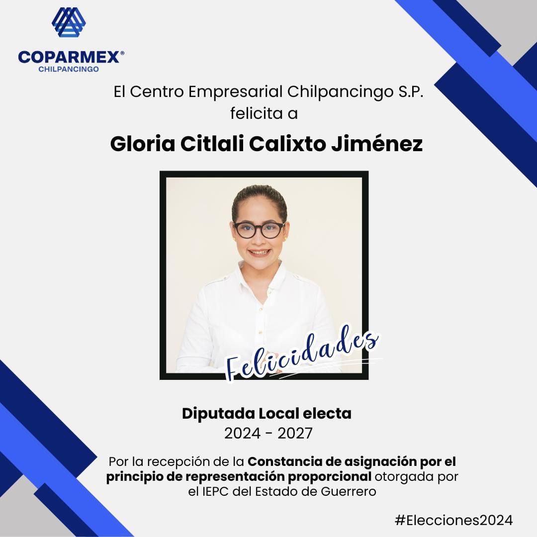 COPARMEX Chilpancingo extiende sus más sinceras felicitaciones a Citlali Calixto por haber recibido la Constancia de Asignación por el Principio de Representación Proporcional que la acredita como Diputada Local Electa.