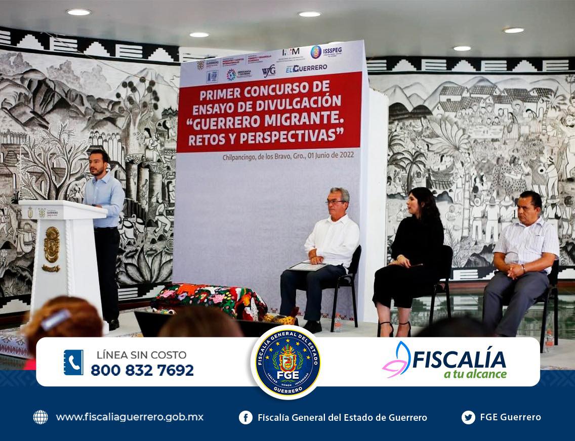 Chilpancingo, Gro. 2 de junio de 2022.-La Mtra. María Fernanda Palomares Peralta, Directora General de Atención Ciudadana asistió en representación de la Fiscal General del Estado, Mtra. Sandra Luz Valdovinos Salmerón asistió a la primera convocatoria de ensayo “Guerrero migrante, retos y perspectivas” .