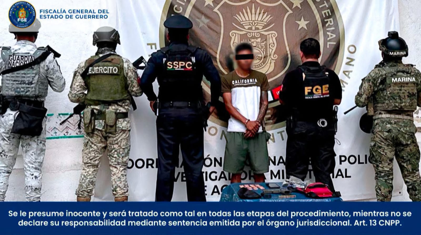 La Fiscalía General del Estado de Guerrero (FGE Guerrero), en coordinación con la Secretaría de la Defensa Nacional (DEFENSA), Guardia Nacional (GN), Secretaría de Marina (SEMAR) y la Secretaría de Seguridad y Protección Ciudadana Federal (SSPC), logró la detención en flagrancia de un masculino identificado como Jesús “N”, en el municipio de Acapulco de Juárez.