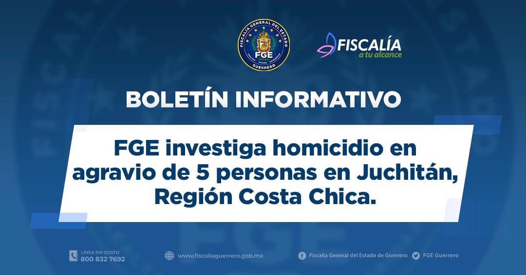 Chilpancingo, Gro. 12 de abril de 2022.- La Fiscalía General del Estado informa que investiga el delito de homicidio calificado, en agravio de 5 personas del sexo masculino encontrados en el interior de un vehículo, en contra de quien o quienes resulten responsables, en el municipio de Juchitán, región Costa Chica, integrando la carpeta de investigación correspondiente.