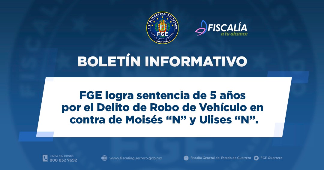 Chilpancingo, Gro. 25 mayo 2022. La Fiscalía General del Estado logra sentencia condenatoria en contra de Moisés “N” y Ulises “N” por el término de 5 años de prisión y el pago de la reparación del daño ocasionado a la víctima, por el Delito de Robo de Vehículo, hechos ocurridos en el Puerto de Acapulco, Gro.