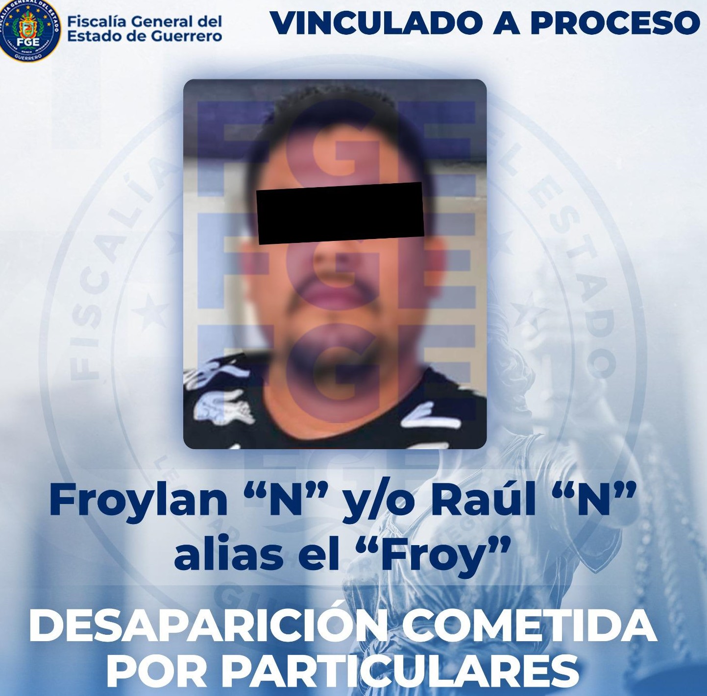 La Fiscalía General del Estado de Guerrero (FGE Guerrero) informa que obtuvo la vinculación a proceso de Froylán “N” y/o Raúl “N”, alias “El Froy”, por su probable responsabilidad en el delito de desaparición cometida por particulares, en agravio de una víctima de identidad reservada, en el municipio de Acapulco de Juárez.