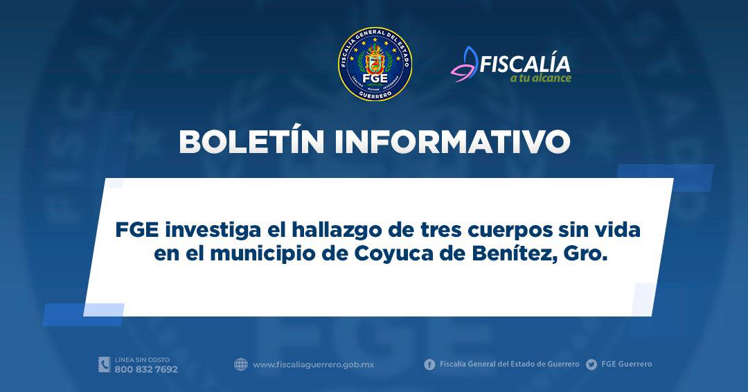 Chilpancingo, Gro. a 20 de mayo de 2022. La Fiscalía General del Estado inicia carpeta de investigación, por el hallazgo de tres cuerpos sin vida.