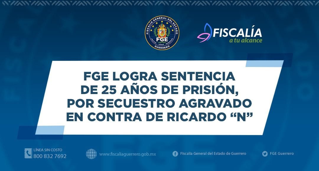 Chilpancingo, Gro. 25 de febrero de 2022.- La Fiscalía General del Estado de Guerrero a través de la Fiscalía Especializada de Combate al Secuestro logró sentencia condenatoria de 25 años de prisión, en contra de Ricardo “N” alias El Cachetes”, como probable responsable del delito de secuestro agravado, en Coyuca de Benítez.
