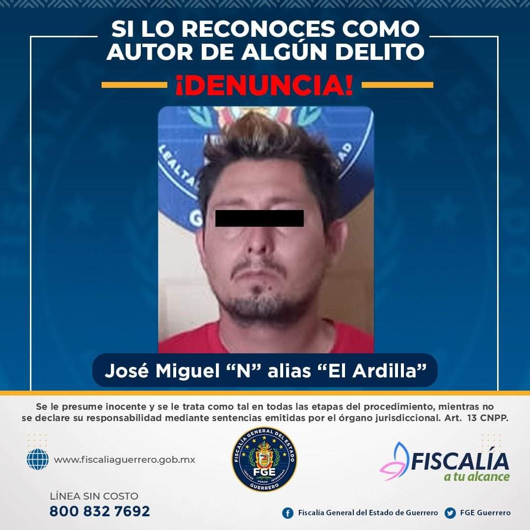 Chilpancingo, Gro. 20 de febrero de 2022.- La Fiscalía General de Guerrero en coordinación con su homóloga la Fiscalía General del Estado de México, dieron cumplimiento a la orden de aprehensión en contra de José Miguel “N” alias “El Ardilla”, acusado de homicidio calificado y señalado como jefe de plaza del Cártel Independiente de Acapulco (CIDA), considerado como uno de los principales generadores de violencia en la ciudad de Acapulco y uno de los objetivos prioritarios, la detención fue realizada en la ciudad de Toluca de Lerdo, Estado de México.