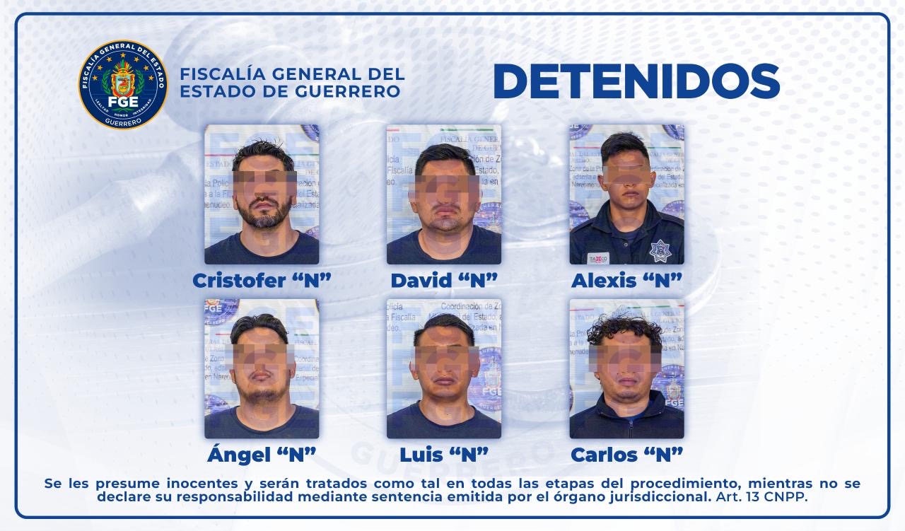 Chilpancingo, Gro. a 02 de septiembre de 2024.— La Fiscalía General del Estado de Guerrero (FGE Guerrero) cumplimentó una orden de aprehensión en contra de Luis “N”, David “N”, Carlos “N”, Cristofer “N”, Alexis “N” y Ángel “N”, policías en activo de la Secretaría de Seguridad Pública de Taxco de Alarcón por su presunta participación en el delito de desaparición forzada en agravio de una víctima de identidad reservada.