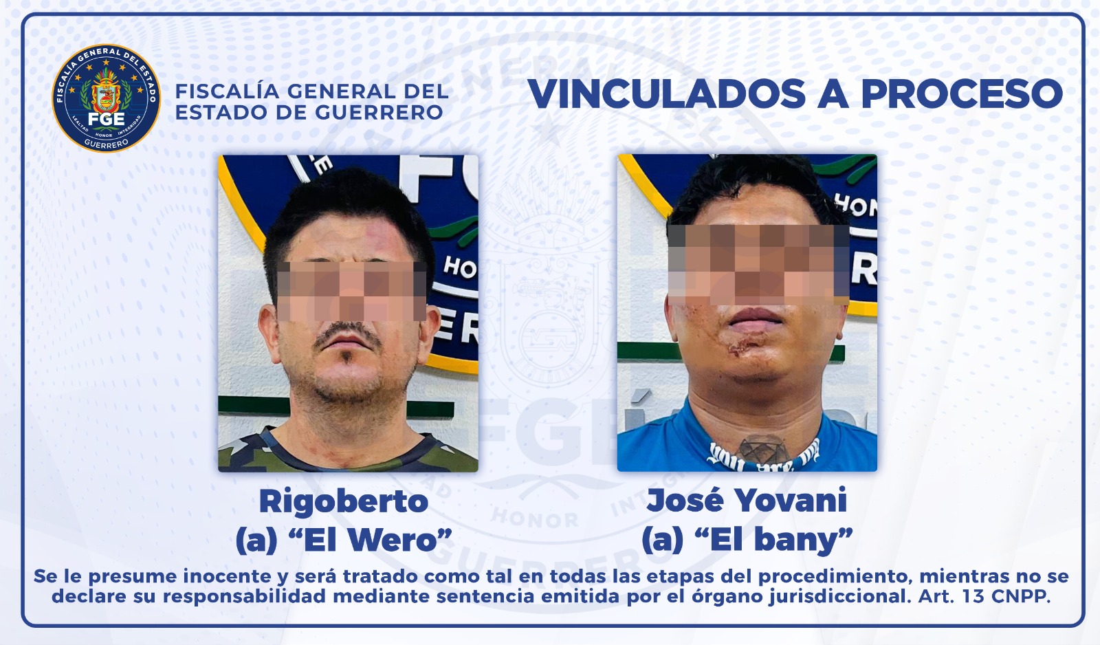 Chilpancingo, Gro. a 24 de julio de 2024.- En seguimiento puntual a las investigaciones, la Fiscalía General del Estado de Guerrero, logró vincular a proceso a Rigoberto “N”, alias “El Wero” y a José “N”, alias “El Bany”, presuntos integrantes del grupo delictivo identificado como “Los Totos”, por el delito de privación de la libertad personal en agravio de víctimas de identidad reservada y por homicidio en grado de tentativa en agravio de seis agentes ministeriales, en relación con los hechos ocurridos en Acapulco de Juárez.