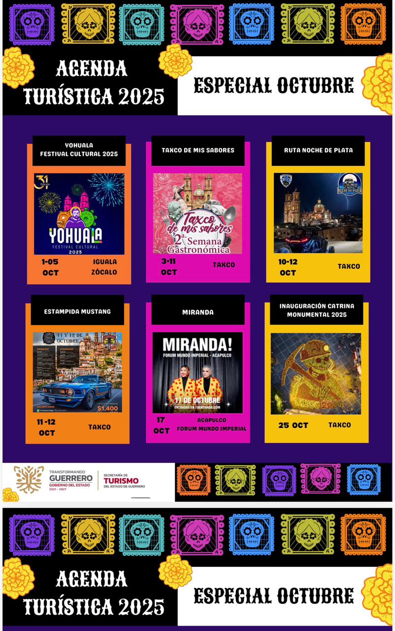 Con este panorama, el clima se convierte en un aliado para quienes deseen aprovechar la Agenda Turística de Octubre 2025, que ofrece una variada programación cultural y recreativa en todo el estado, desde el Festival de Catrinas y Día de Muertos en Taxco, hasta la Carrera El Sol y la Mega Ofrenda “Una Noche en Mictlán” en Acapulco, así como los festivales en Ixtapa-Zihuatanejo, Tixtla y La Unión.
