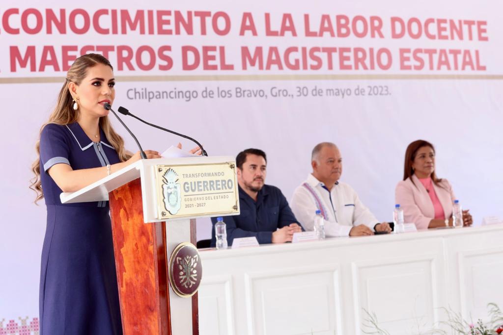 En este evento desde la Casa del Pueblo en Chilpancingo, la gobernadora destacó que las y los maestros son uno de los factores más importantes de la Revolución Educativa en Guerrero, por lo que se ha establecido una estrategia permanente de fortalecimiento a las capacidades tecnológicas y humanas para formar desde las aulas a las niñas, niños y jóvenes con educación de calidad.