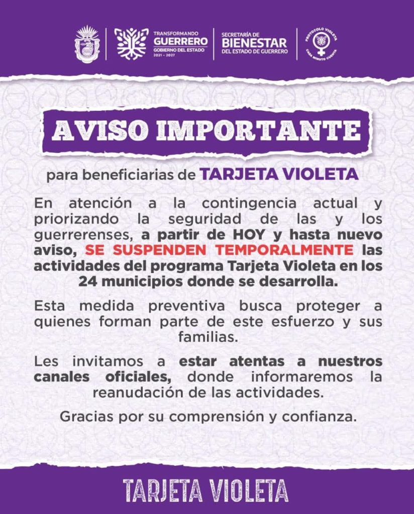 “En atención a la contingencia actual y priorizando la seguridad de las y los guerrerenses, a partir de hoy y hasta nuevo aviso, se suspenden temporalmente las actividades del programa Tarjeta Violeta en los 24 municipios donde se desarrolla”, informa.