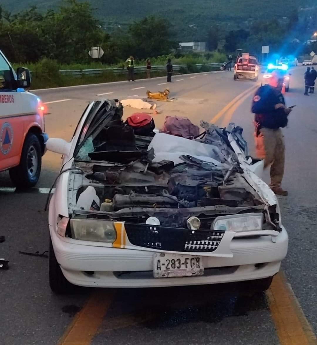 El reporte indica que el taxi circulaba con dirección a la capital, cuando un tráiler hizo una maniobra sin precaución para salirse del bulevar, provocando que la unidad del servicio público prácticamente pasara por debajo de la caja de carga de la pesada unidad, quedando aplastado el toldo del auto Tsuru.