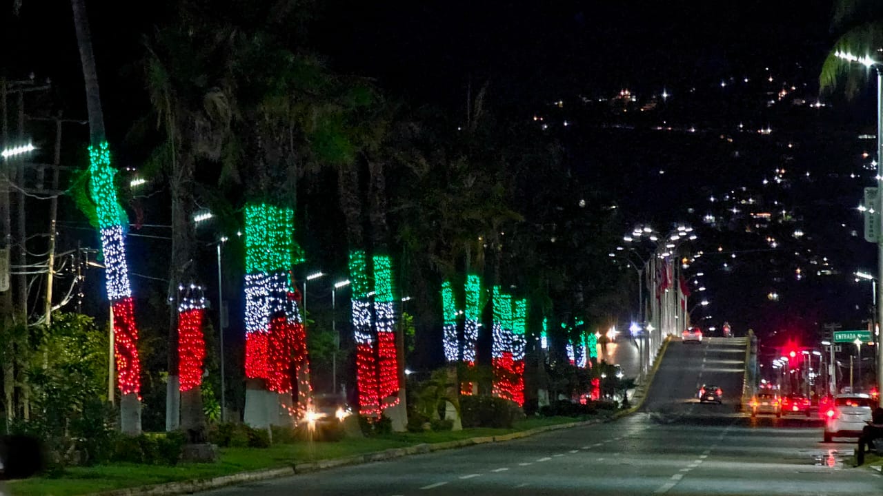 Las palmeras de esta vía que mide pasados los cinco kilómetros, han sido decoradas con luces de los tres colores patrios: verde, blanco y rojo.