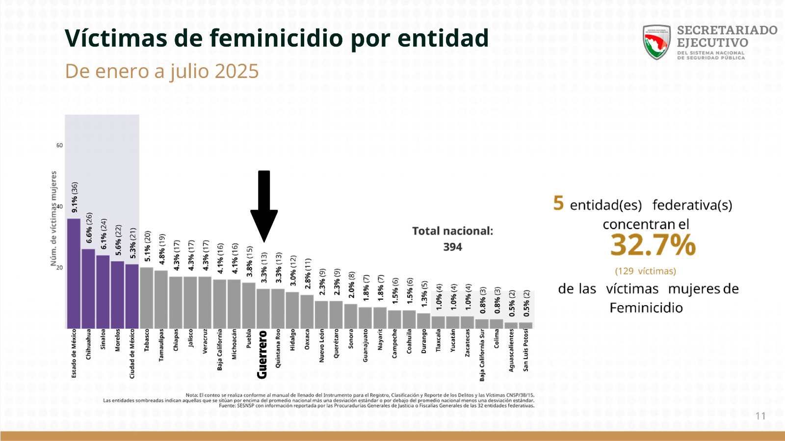En la tasa de víctimas de feminicidio por cada 100 mil mujeres, Guerrero se ubica en el lugar 12 a nivel nacional. Asimismo, en el total de víctimas registradas de enero a julio, la entidad ocupa el lugar 14 con 13 casos, lo que representa el 3.3% del total nacional.