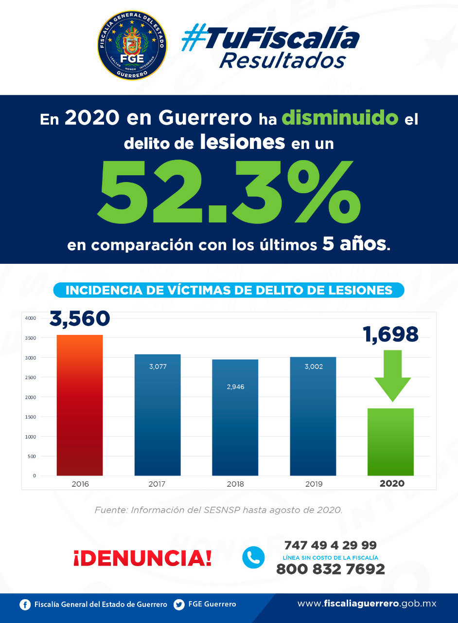 Chilpancingo, Gro., 14 de octubre de 2020.- Dentro de la estrategia de seguridad que ha implementado la Mesa de Coordinación para la Construcción de la Paz, que encabeza el gobernador Héctor Astudillo Flores, la Fiscalía General del Estado informa que en 2020 Guerrero se ubica en el nivel más bajo de los últimos 5 años con 1,698 víctimas del delito de lesiones, lo que representa una disminución del 52.3%.