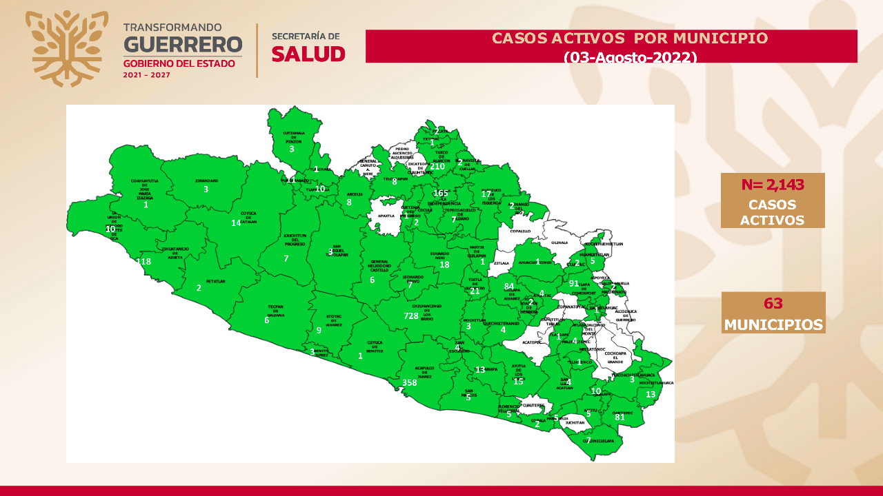 Desde el inicio de la pandemia, la entidad acumula 112,365 casos confirmados y 6,801 defunciones; a nivel nacional ocupa el lugar 22 en casos activos, concentrados en 63 municipios, entre los que destacan: Chilpancingo, 728; Acapulco, 358; Taxco, 210; Iguala, 165; Zihuatanejo, 118; Tlapa, 91; Chilapa, 84; Ometepec, 81; Tixtla , 21; y Eduardo Neri, 18.