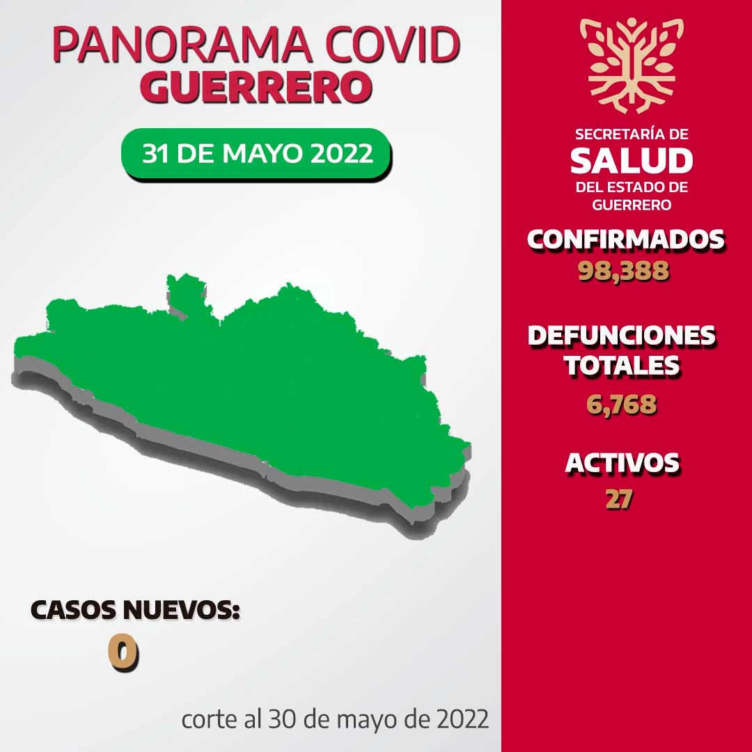 La dependencia estatal indicó que a la fecha, en Guerrero se acumulan 98,388 casos confirmados por Covid-19, con 27 casos activos que se ubican en los municipios de Acapulco, con 14; Taxco, 12, y La Unión, con 1.
