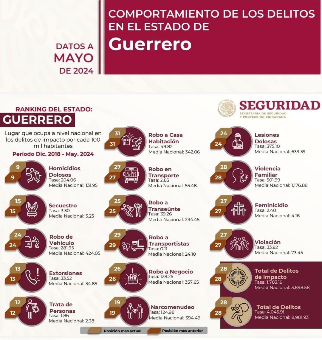 Ciudad de México., 19 de junio del 2024. – De acuerdo con el reciente reporte del Secretariado Ejecutivo del Sistema Nacional de Seguridad Pública (SESNSP), correspondiente al mes de mayo, el estado de Guerrero destaca por mantener una baja incidencia delictiva en comparación con otras entidades del país.