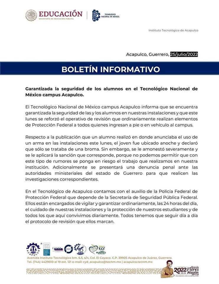 “En el Tecnológico de Acapulco contamos con el auxilio de la Policía Federal de Protección Federal que depende de la Secretaría de Seguridad Pública Federal. Ellos están encargados de vigilar y garantizar ordinariamente, las 24 horas del día, el cuidado de nuestras instalaciones y la protección de nuestros estudiantes y de todos los que aquí convivimos diariamente”, señala el comunicado.