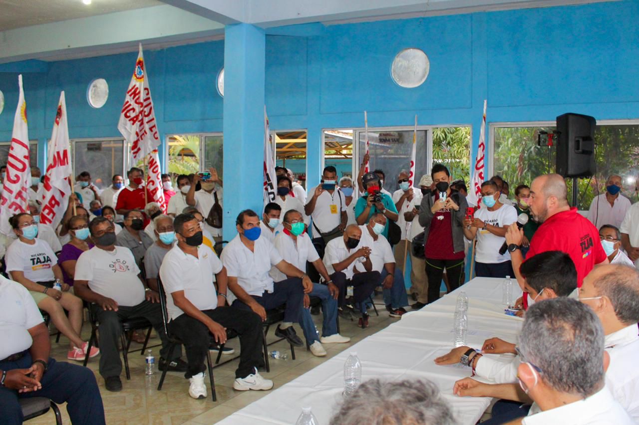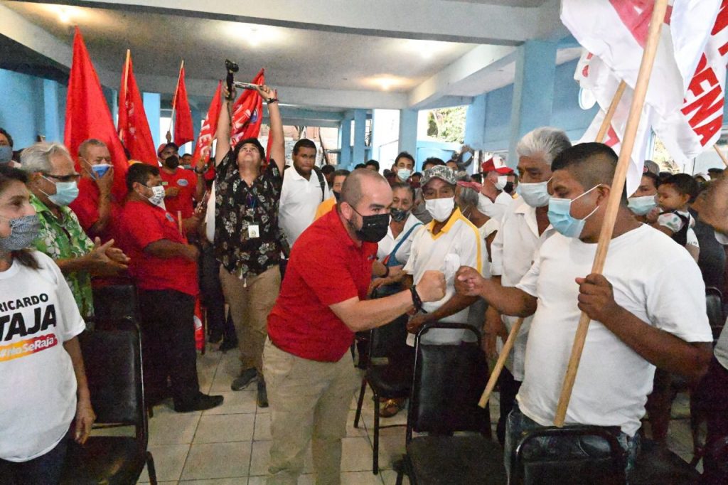 Acapulco Gro.- 10 de Mayo de 2021.- Los candidatos de la alianza PRI-PRD a la gubernatura de Guerrero, Mario Moreno Arcos, y a la alcaldía de Acapulco, Ricardo Taja Ramírez, recibieron el respaldo de la Organización de los transportistas Grupo Sur, quienes los recibieron con algarabía, banderas, matracas en mano y trompetas en la Casa del Taxista Guerrerense en la colonia Garita.