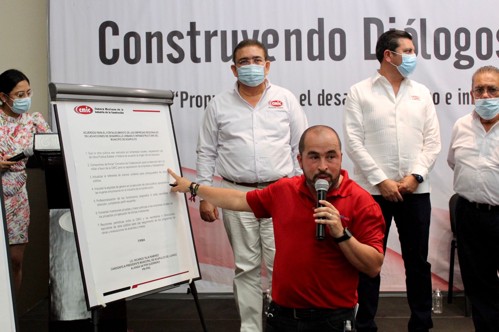 Acapulco Gro.- 13 de mayo de 2021.- El candidato de la coalición PRI-PRD a la alcaldía de Acapulco, Ricardo Taja Ramírez, se comprometió con los integrantes de la Cámara Mexicana de la Industria de la Construcción en que todas las obras que se hagan en el municipio serán para empresas locales en apoyo a la economía de quienes le apuestan al destino.