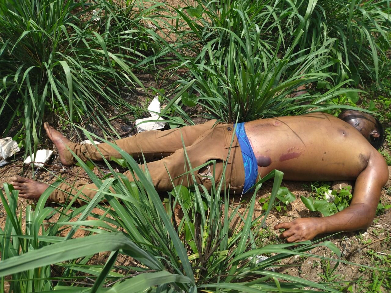 Las autoridades informaron que el cuerpo fue hallado en estado de descomposición, con golpes en el cuerpo y al parecer una cuerda en el cuello; vestía un pantalón beige, sin playera.