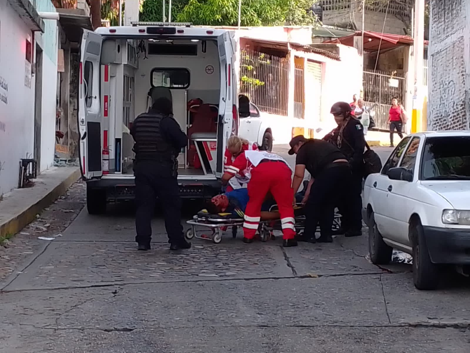 El hombre quedó herido y tendido en la calle atrás de un vehículo blanco que estaba estacionado; el lesionado fue auxiliado por paramédicos de la Cruz Roja que lo trasladaron a un hospital para su atención médica.