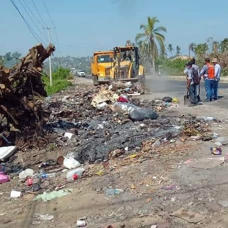Trabajadores del Ayuntamiento arribaron a la unidad habitacional Nuevo Horizonte para Guerrero, en la carretera Federal Acapulco-Pinotepa, a la altura del poblado de Tuncingo, donde con palas, seis tractocamiones de 14 metros y una retroexcavadora, realizaron el retiro de desechos en la vialidad y el barranco.