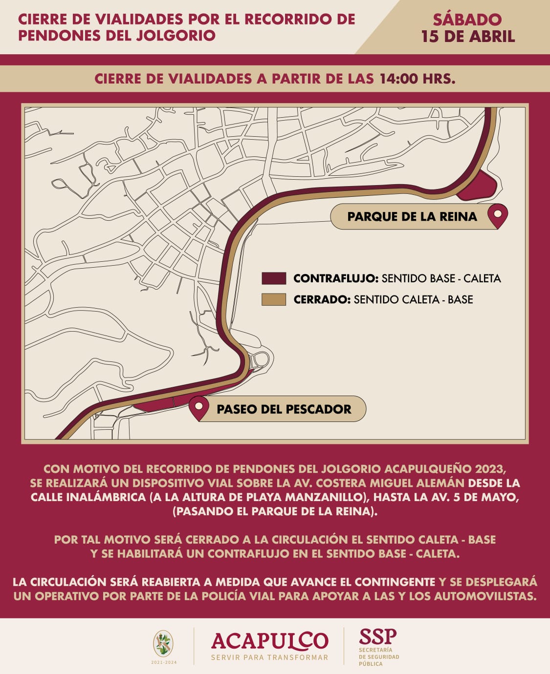 Acapulco, Gro., 14 de abril de 2023.– Con la finalidad de agilizar la circulación, la Secretaría de Seguridad Pública Municipal (SSP), a través de la Policía Vial, implementará un dispositivo vial por el recorrido de pendón y danzas de las ocho regiones del estado, como parte de las actividades en la segunda edición del Jolgorio Acapulqueño 2023.