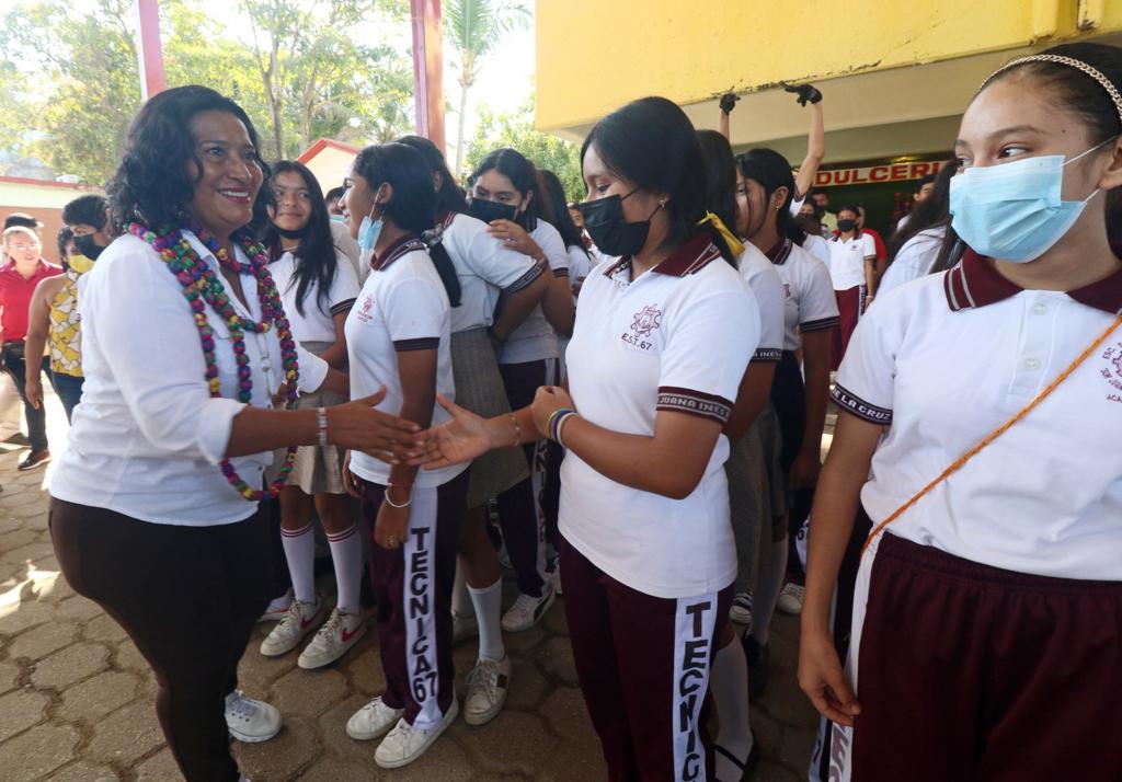 La alcaldesa, Abelina López, inició su recorrido con la inauguración del techado de la cancha de la escuela secundaria técnica 67 “Sor Juana Inés de la Cruz”, en San Isidro, obra en la que su gobierno invirtió un millón 100 mil pesos.