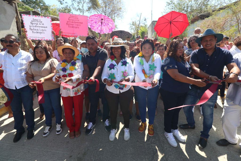 Acapulco, Gro., 01 de marzo de 2023.-Al encabezar una gira de trabajo por la zona Poniente de la ciudad, la presidenta municipal, Abelina López Rodríguez, inauguró obras de pavimentación en calles, andadores y el techado de una cancha escolar, en las colonias Ampliación San Isidro y Jardín Mangos, por un monto cercano a los 3 millones de pesos.