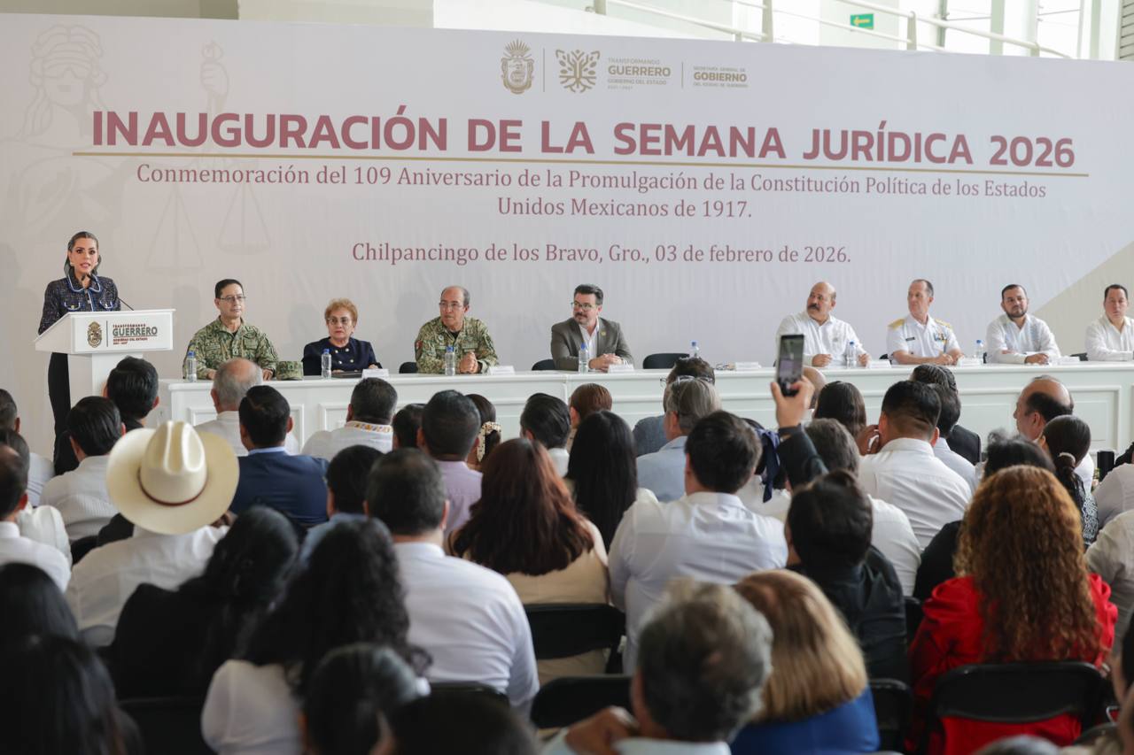 Chilpancingo, Gro., 3 de febrero de 2026.- Al inaugurar los trabajos de la Semana Jurídica 2026, en el marco del 109 aniversario de la promulgación de la Constitución Política de los Estados Unidos Mexicanos de 1917, la gobernadora Evelyn Salgado Pineda convocó a seguir construyendo un Guerrero donde la ley deje de ser distante al pueblo y se convierta en una garantía viva de igualdad, justicia y paz social.