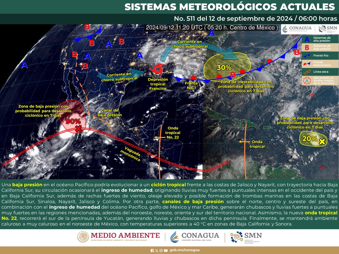 De acuerdo con el Servicio Meteorológico Nacional (SMN), este día, canales de baja presión sobre el norte, centro y sureste del país, en combinación con el ingreso de humedad del océano Pacífico, golfo de México y mar Caribe, generarán lluvias puntuales muy fuertes en regiones de Guerrero.