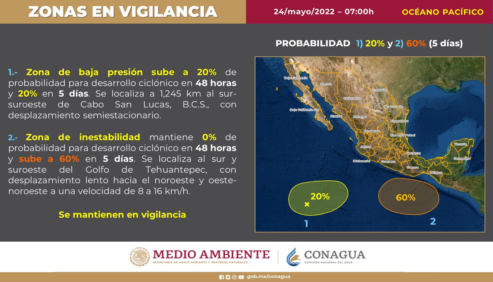 De acuerdo con el reporte matutino del Servicio Metereológico Nacional (SMN), hay una zona de baja presión con 20 por ciento de probabilidad para desarrollo ciclónico en las próximas 48 horas y de un 20 por ciento en cinco días.