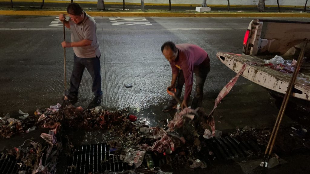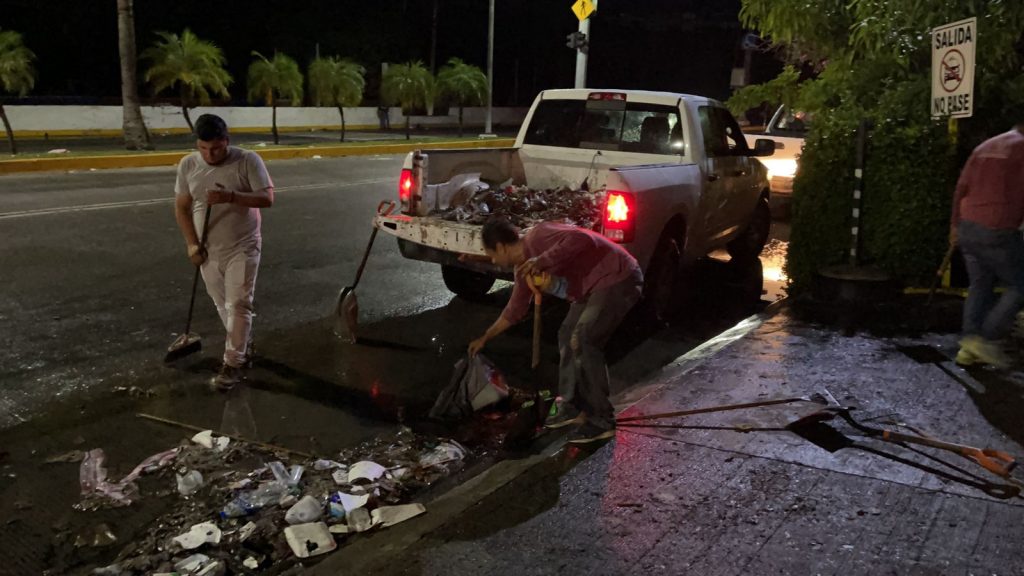 Desde anoche, cuando cayó fuerte lluvia en el puerto de Acapulco, los empleados municipales, encabezados por su coordinador Juan Carlos Manrique García, recorrieron las principales vialidades para retirar desechos que taponearon rejillas del alcantarillado pluvial.