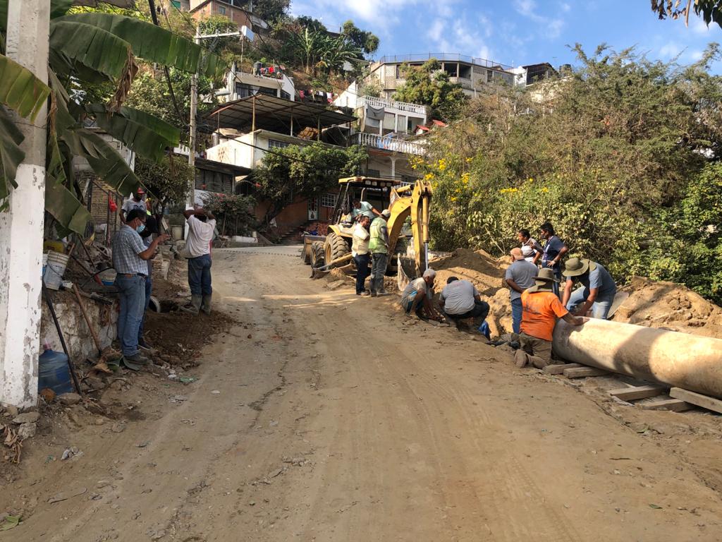 Acapulco, Gro., 26 de enero de 2021.- Personal operativo de la Comisión de Agua Potable y Alcantarillado del Municipio de Acapulco (Capama) colabora con materiales y mano de obra para acelerar la reparación de la línea hidráulica de bombeo que dañó la empresa particular que pavimenta la calle Ballena, acceso a las colonias Primero de Mayo y Lázaro Cárdenas.