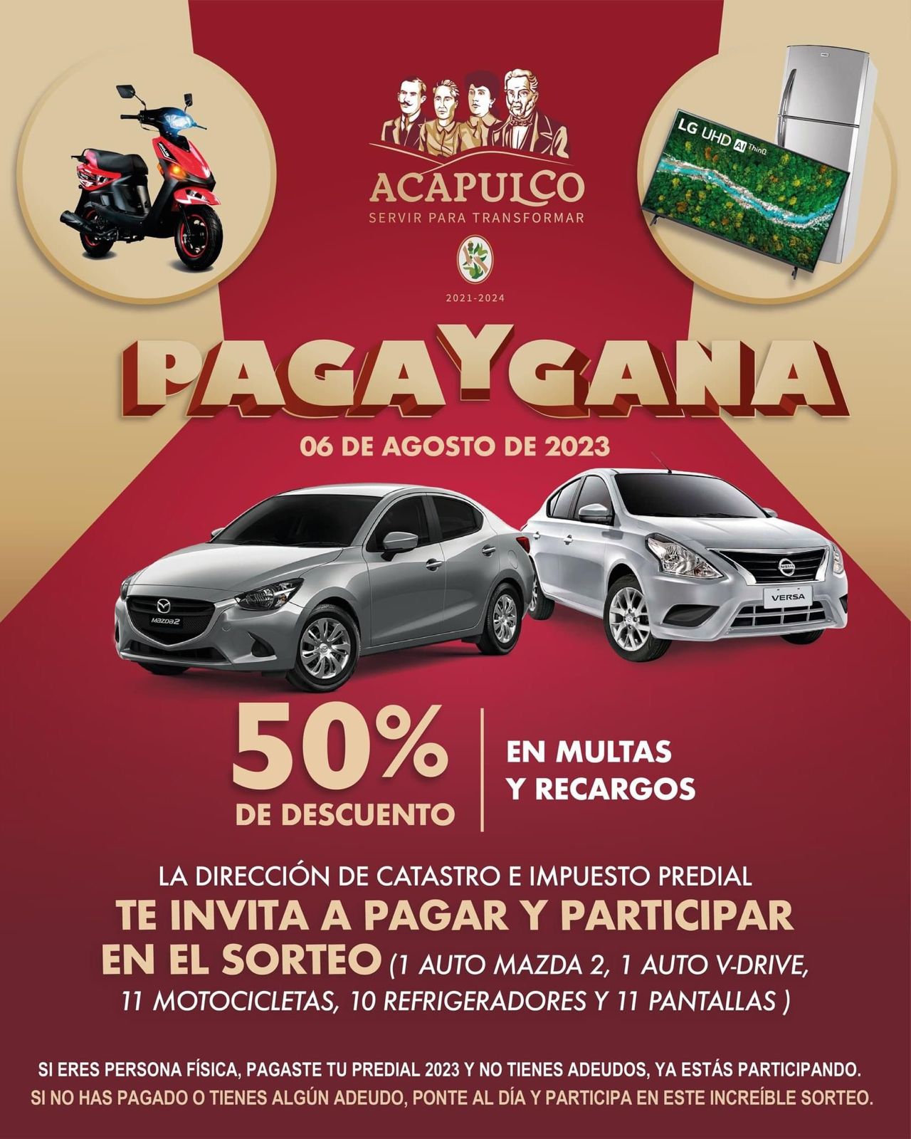 Acapulco, Gro., 07 de julio de 2023.– El gobierno que preside Abelina López Rodríguez, invita a la población, a ponerse al corriente en el pago del impuesto predial, aprovechar la campaña “Paga y Gana”, y obtener uno de los 34 premios que se entregarán a las y los contribuyentes cumplidos.