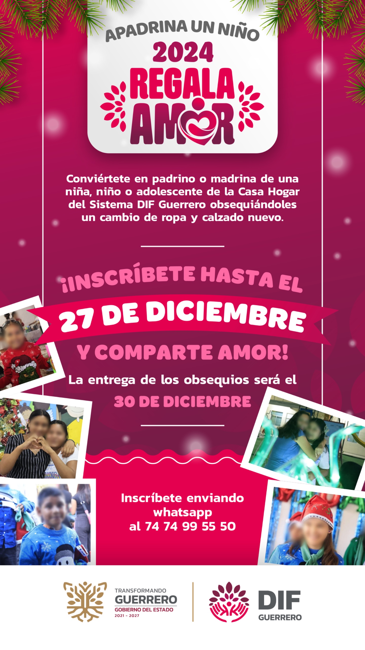Puedes solicitar información a través de las páginas oficiales del gobierno del Estado, así como las páginas del DIF Guerrero, así mismo puedes solicitar información e inscribirte hasta el 27 de diciembre enviando un WhatsApp al 74 74 99 55 50.