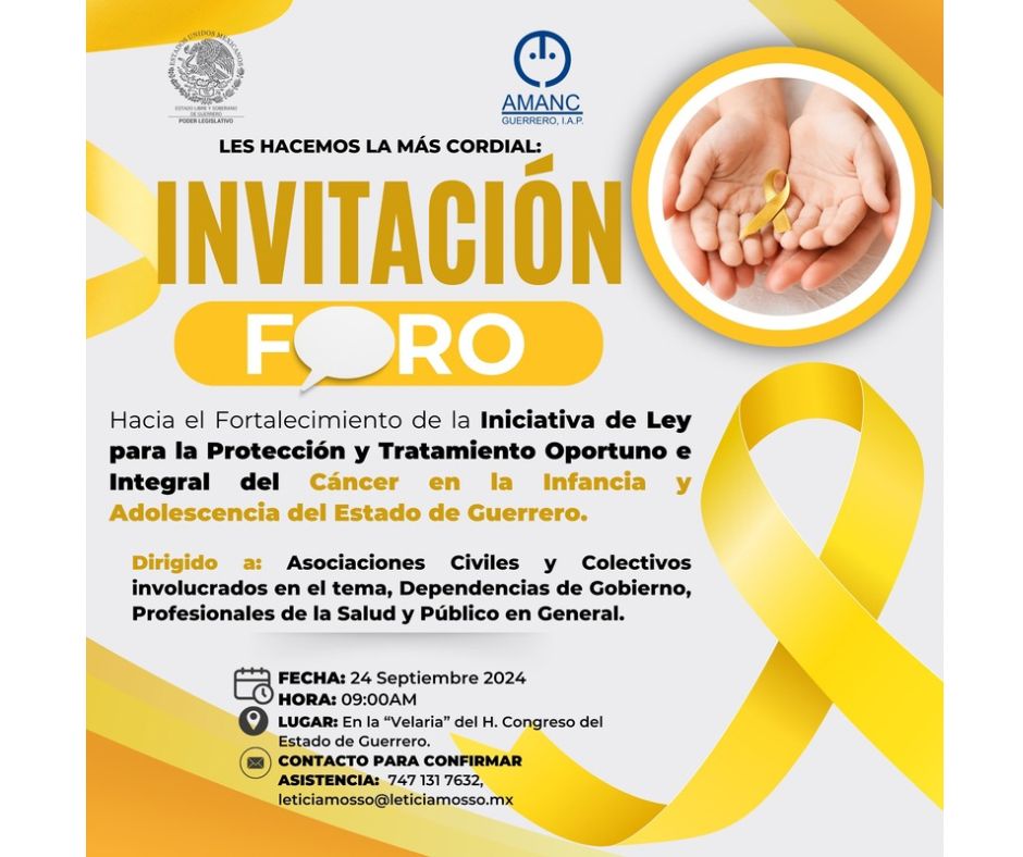 Chilpancingo, Gro., 23 de septiembre de 2024.- La diputada Leticia Mosso Hernández invita a las asociaciones civiles, colectivos, dependencias de gobierno, profesionales de la salud y al público en general a participar en el Foro para el Fortalecimiento de la Iniciativa de Ley para la Protección y Tratamiento Oportuno e Integral del Cáncer en la Infancia y en la Adolescencia del Estado de Guerrero.
