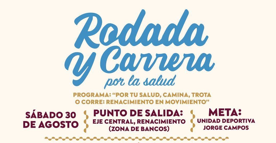 La rodada y carrera se llevarán a cabo el sábado 30 de agosto a las 8:30 de la mañana, partiendo de la zona de bancos de Ciudad Renacimiento hasta el Polideportivo Jorge Campos. La presidenta Abelina López Rodríguez encabezará la jornada, en la que las y los asistentes podrán caminar, trotar o correr, según sus posibilidades.