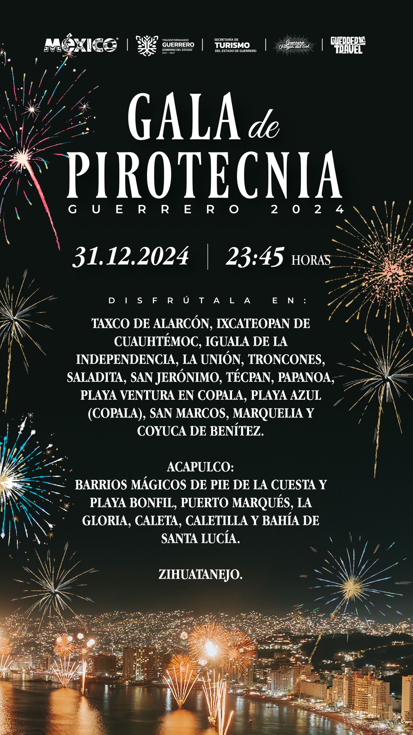 La Gran Gala de Pirotecnia también se podrá disfrutar en otros municipios más como Coyuca de Benítez, Copala, Marquelia, Zihuatanejo, Taxco de Alarcón, Ixcateopan de Cuauhtémoc, Iguala de la Independencia, La Unión, Troncones, Saladita, San Jerónimo, Tecpan, Papanoa.